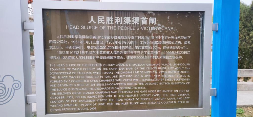 第二站是人民胜利渠爱国主义教育基地,人民胜利渠建成于1952年,渠首位于武陟县境内,至新乡市汇入卫河,是新中国成立后在黄河下游兴建的第一个大型水利工程。人民胜利渠被称为“新中国引黄第一渠”。它见证了新中国战天斗地为人民谋幸福的一段光辉历史。大家分别到毛主席视察纪念馆、渠首闸、展览馆等处进行了参观学习,感受到黄河流域生态保护和高质量发展成果。