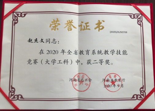 河南省总工会、河南省教育厅于2020年6月至9月在全省教育系统开展了高等院校思政、文科、理科、工科教学技能大赛,经过各级总工会、教学行政部门,高等院校工会、行政及有关单位的精心组织、严密实施,并由河南省教育系统教学技能竞赛领导小组组织的评审委员会评比审定及现场决赛,我校赵杰文老师荣获2020年全省教育系统教学技能竞赛大学工科组二等奖、王卫永老师荣获大学理科组三等奖。