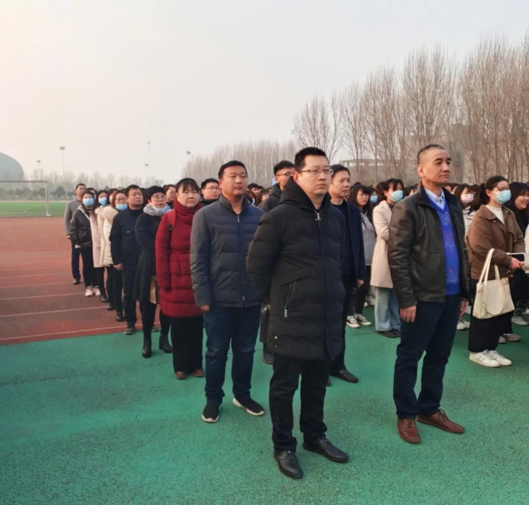 我院全体师生面向国旗庄严肃立,伴随着雄壮的中华人民共和国国歌,鲜艳的五星红旗冉冉升起。