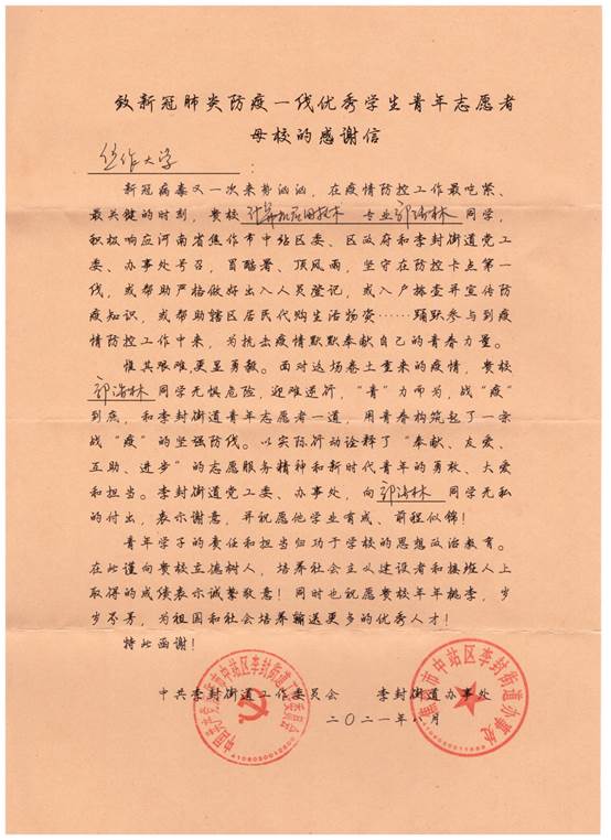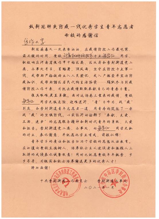 近日,我院收到两封来自焦作市中站区李封街道办事处的感谢信,赞扬我院计算机应用技术专业郭浩林同学和计算机网络技术新生毋华仁同学在暑假期间积极响应号召,踊跃参与疫情防控工作,为抗击疫情默默奉献自己的青春力量。