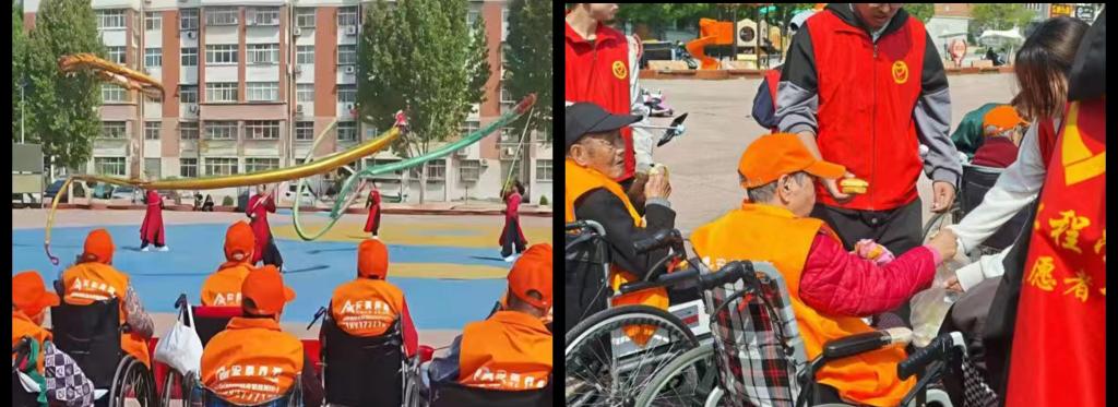 志愿者陪同老人们前往附近广场,一同观看戏曲表演团带来的精彩节目。大家围在老人身旁,全程陪伴老人欣赏演出。活动现场气氛轻松愉悦,温馨祥和,老人们与志愿者脸上均洋溢着幸福的笑容。活动期间,养老院工作人员为老人准备了香蕉和面包。志愿者们主动为老人剥好果皮、分发食物,细心照料老人饮食,以贴心细致的服务温暖着每一位老人。