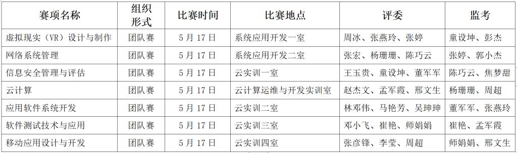 按照2023和2024年河南省高等职业教育学生职业技能大赛赛项,学院将举办应用软件系统开发、移动应用设计与开发、网络系统管理、软件测试技术与应用、虚拟现实(VR) 设计与制作、信息安全管理与评估、云计算7项比赛。